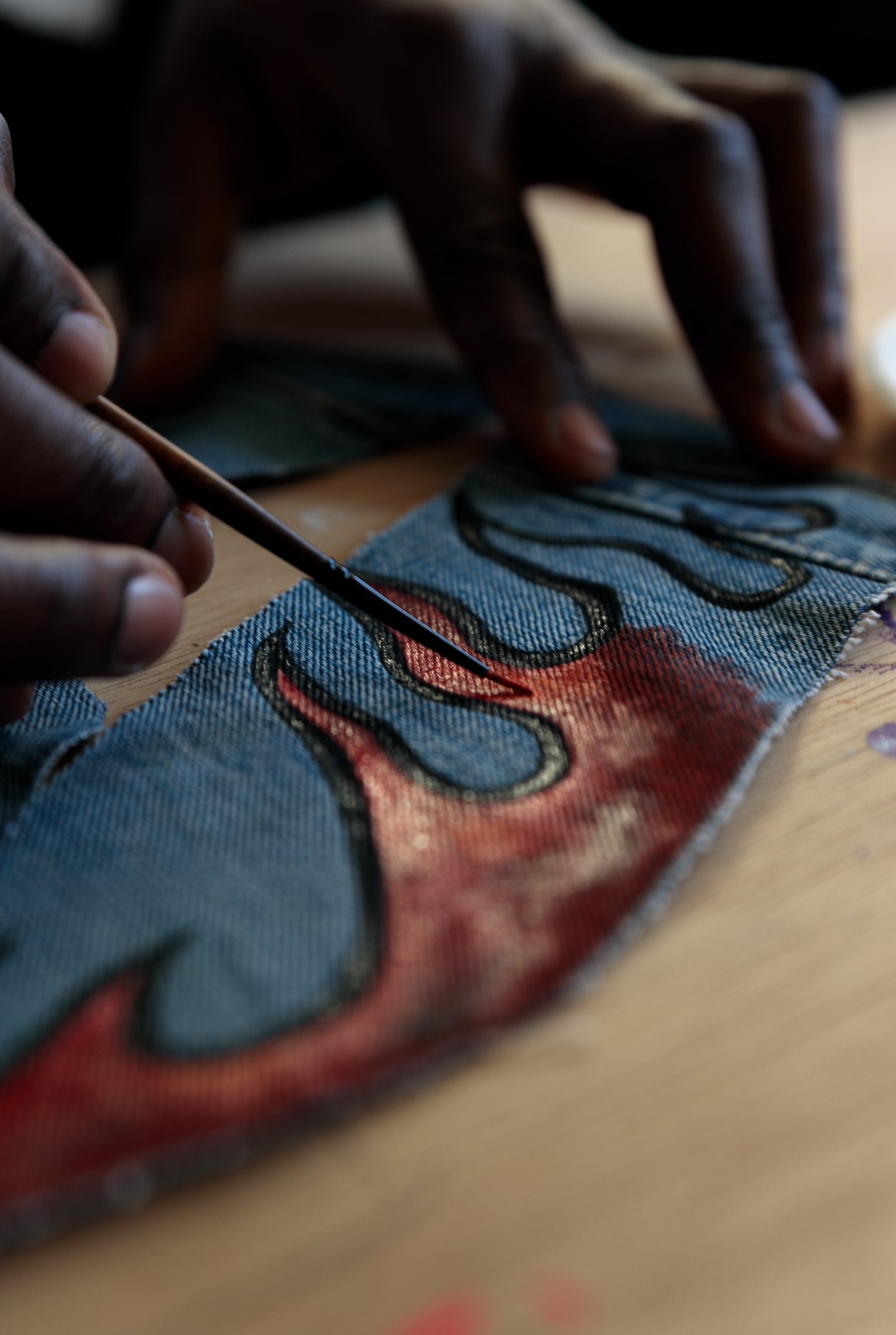 Delicate brushwork and bold flame-like gradations—impossible to replicate by machine—are created using specially developed, proprietary pigments. With wear, the paint evolves alongside the vintage materials, deepening in character and revealing a look that is truly one of a kind.