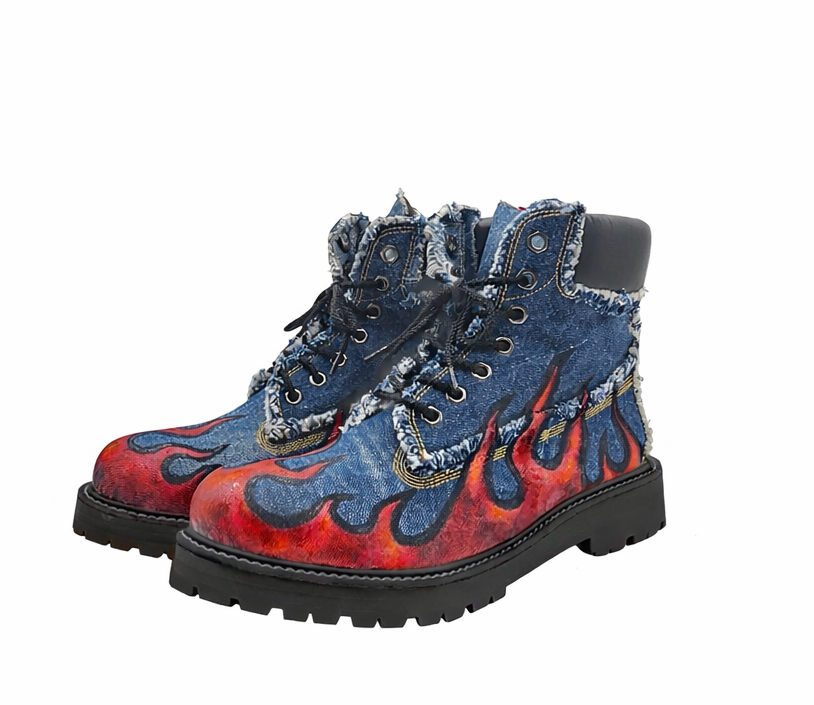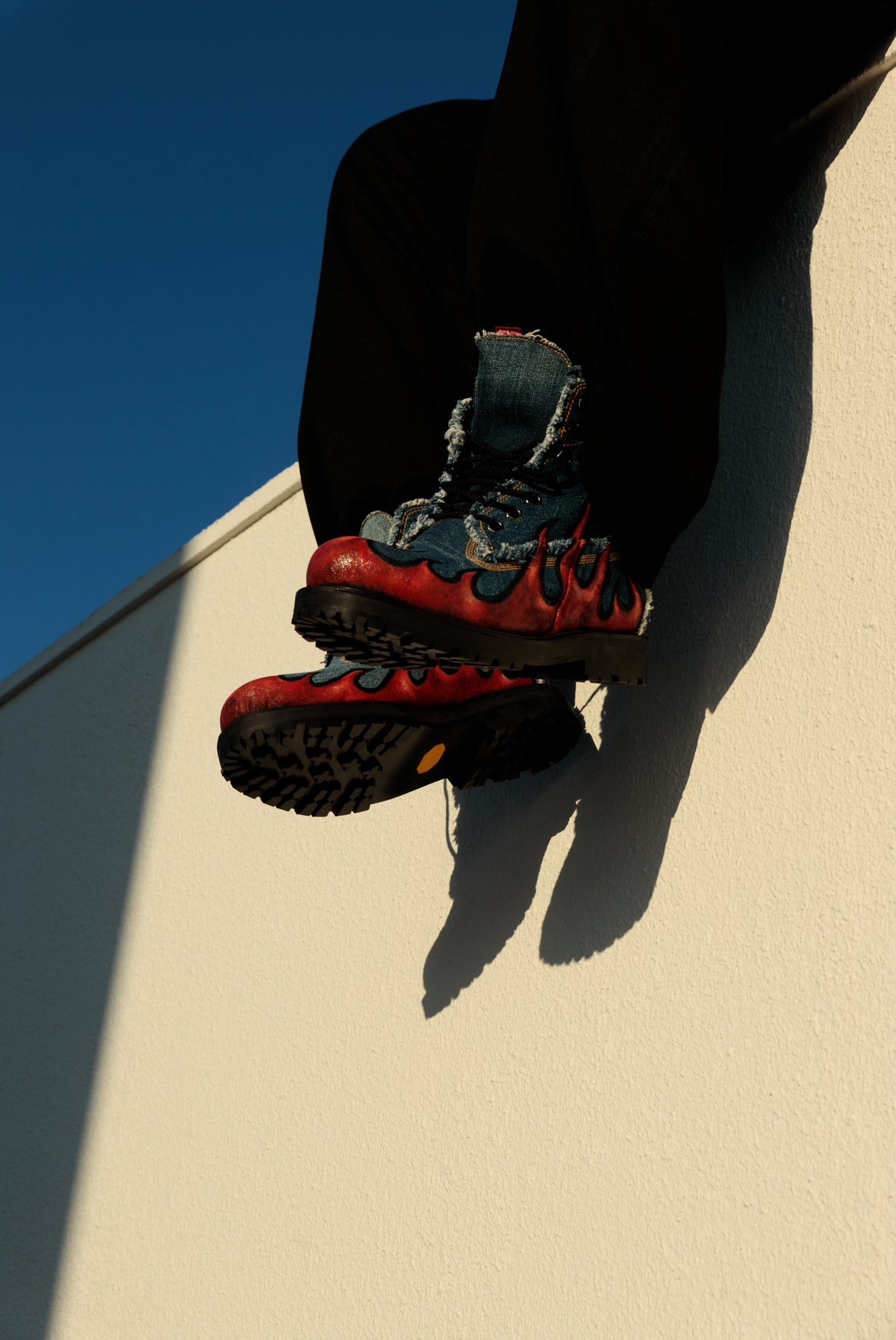 機械では再現できない繊細な筆致と大胆な炎のグラデーションは、独自に開発した特別な染料を用いることで、履き込むほどにヴィンテージ素材とともに深みを増し、世界に二つとない表情を見せていきます。