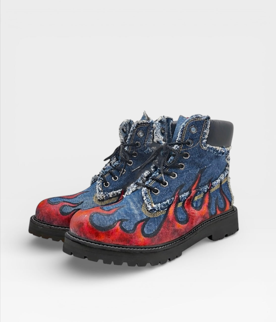 機械では再現できない繊細な筆致と大胆な炎のグラデーションは、独自に開発した特別な染料を用いることで、履き込むほどにヴィンテージ素材とともに深みを増し、世界に二つとない表情を見せていきます。