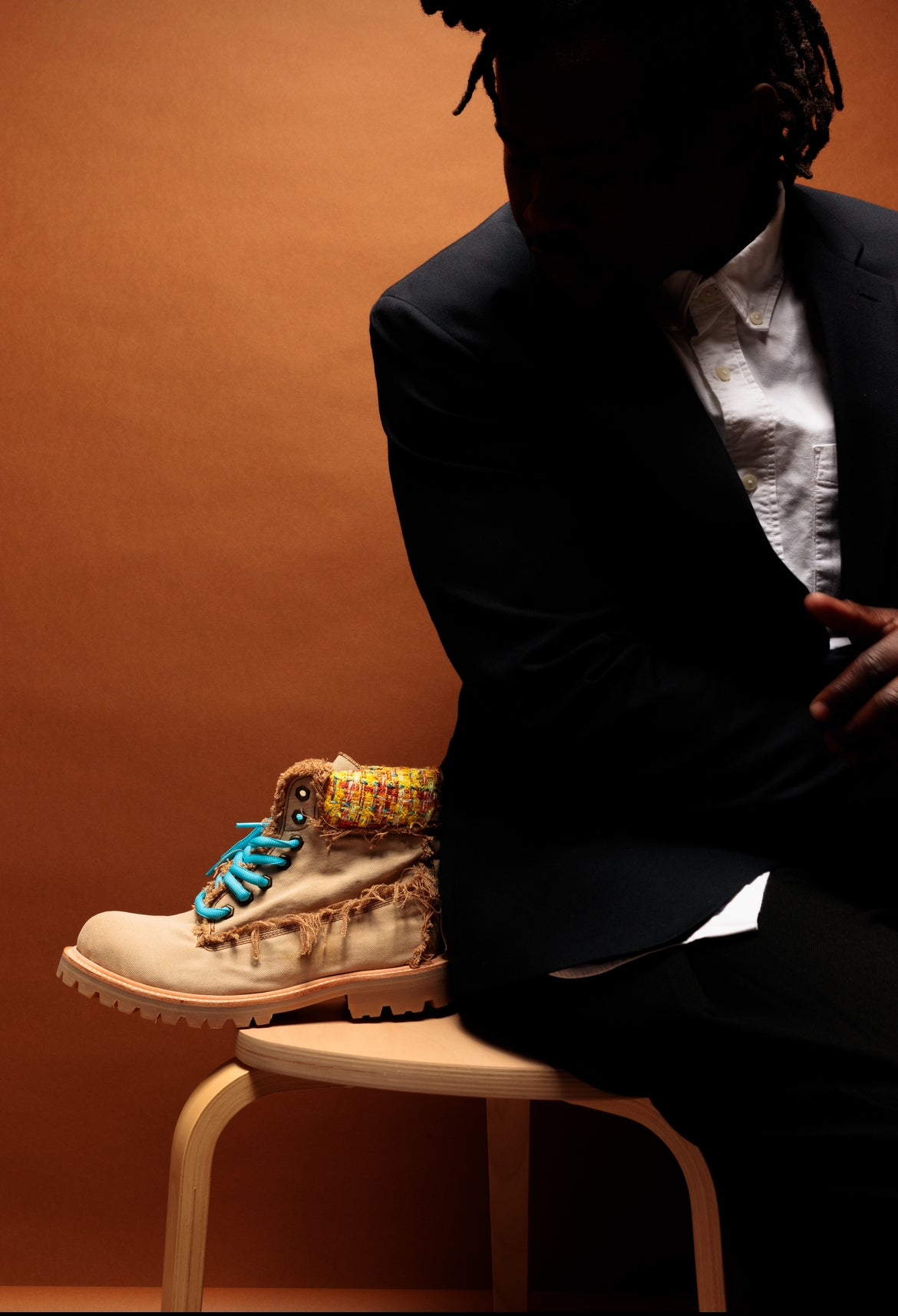 The refined texture of the fabric and the rugged silhouette coexist, creating a quiet yet distinctive presence at the feet.